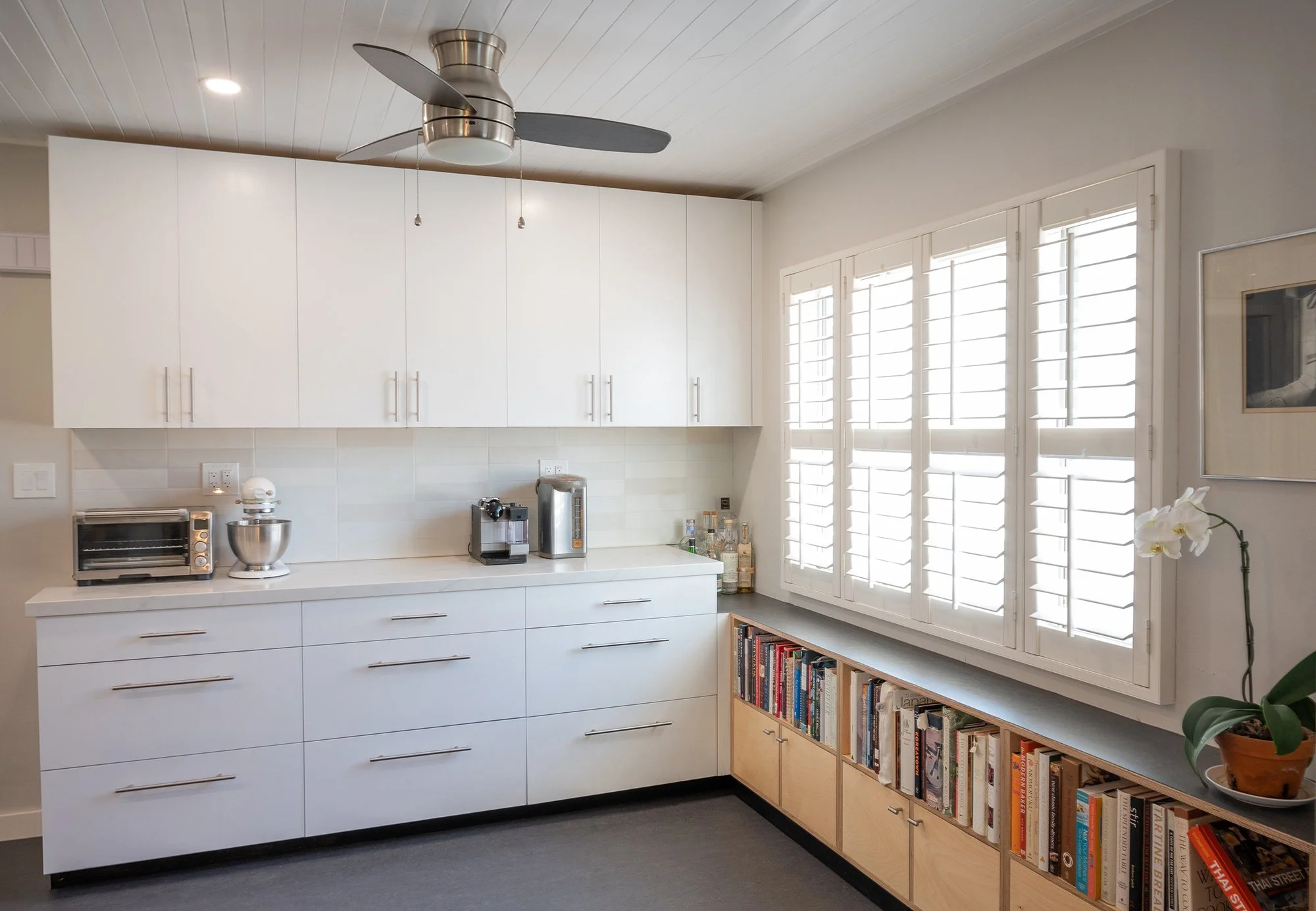 New custom cabinets, backsplash tile, flooring, lighting, ceiling finish, countertops and appliances were part of the this Los Angeles kitchen makeover. We wanted to maintain a light, airy feel while having a lot of storage and functional workspace.